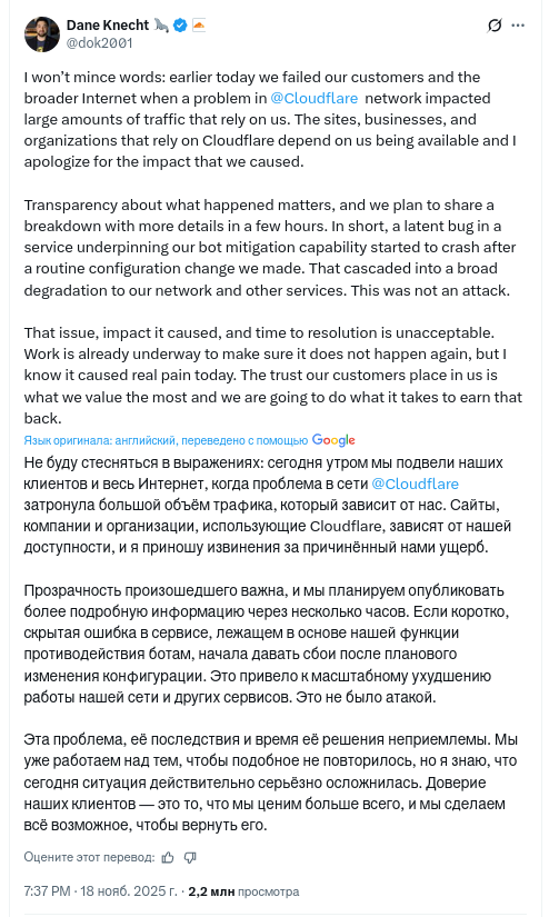 Технический директор Cloudflare Дэн Кнехт пояснил, что сервис «подвёл» своих клиентов и весь Интернет, добавив, что «скрытая ошибка в сервисе, лежащем в основе нашей возможности противодействия ботам, начала давать сбои после внесения нами планового изменения конфигурации... Это не было атакой».