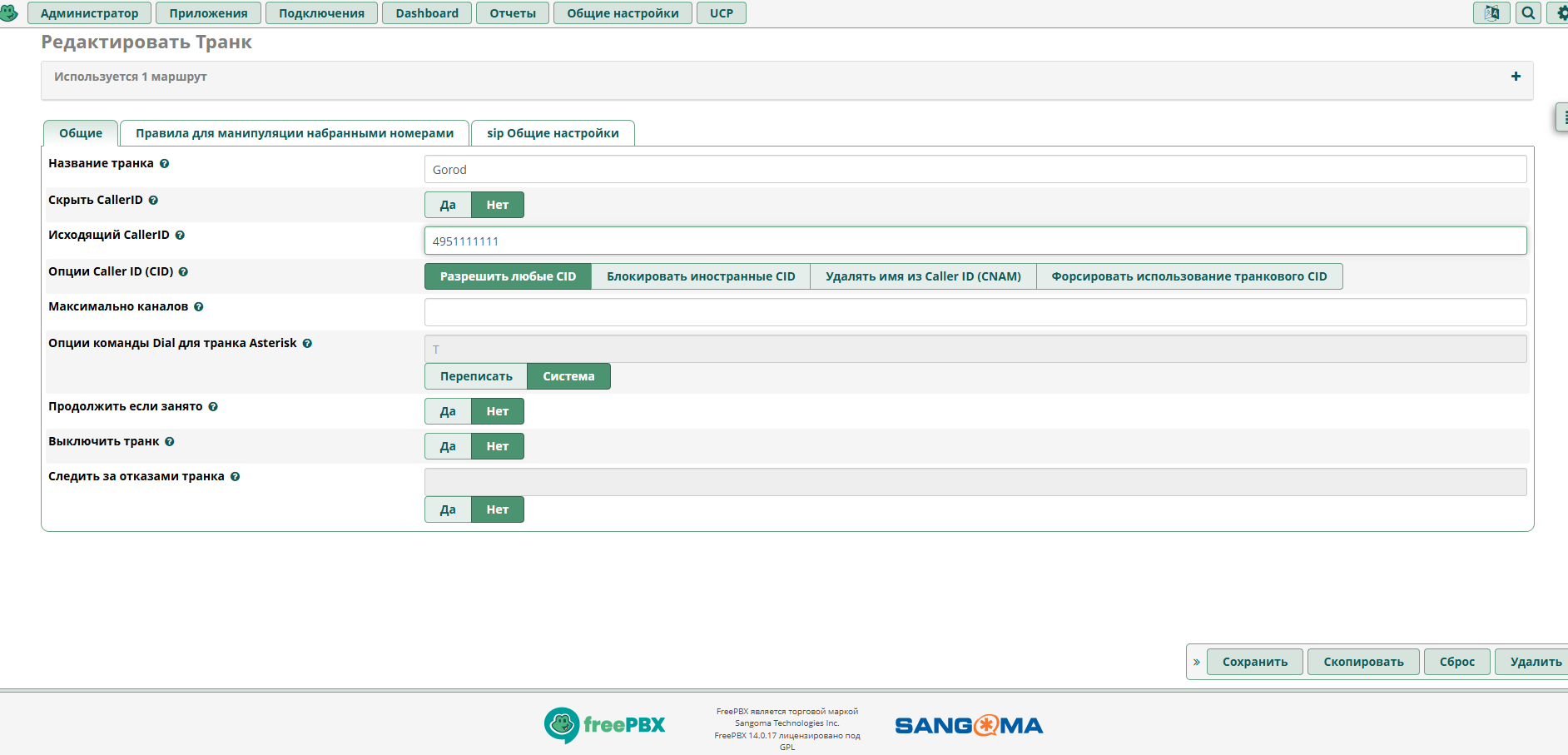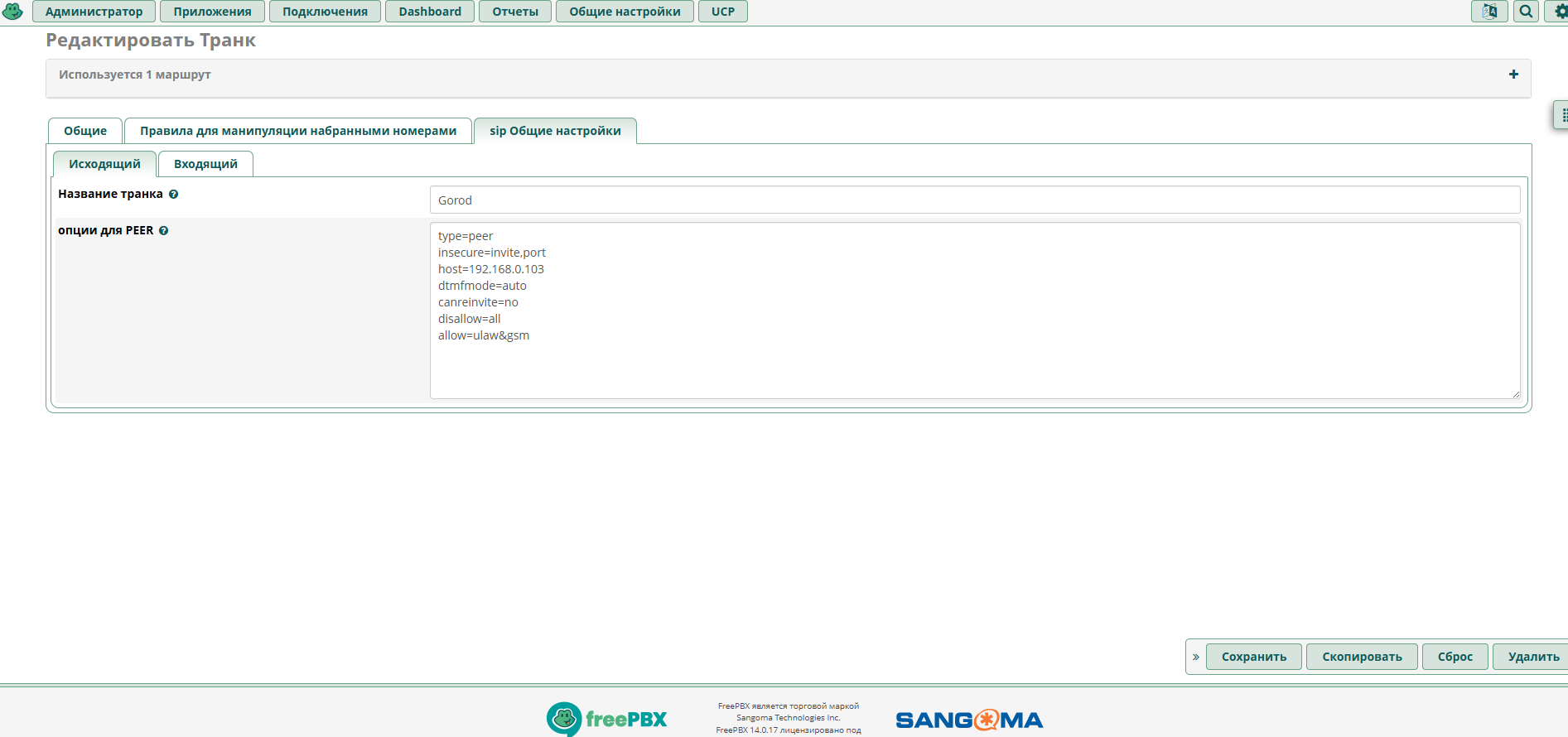 В FREEPBX транк Gorod