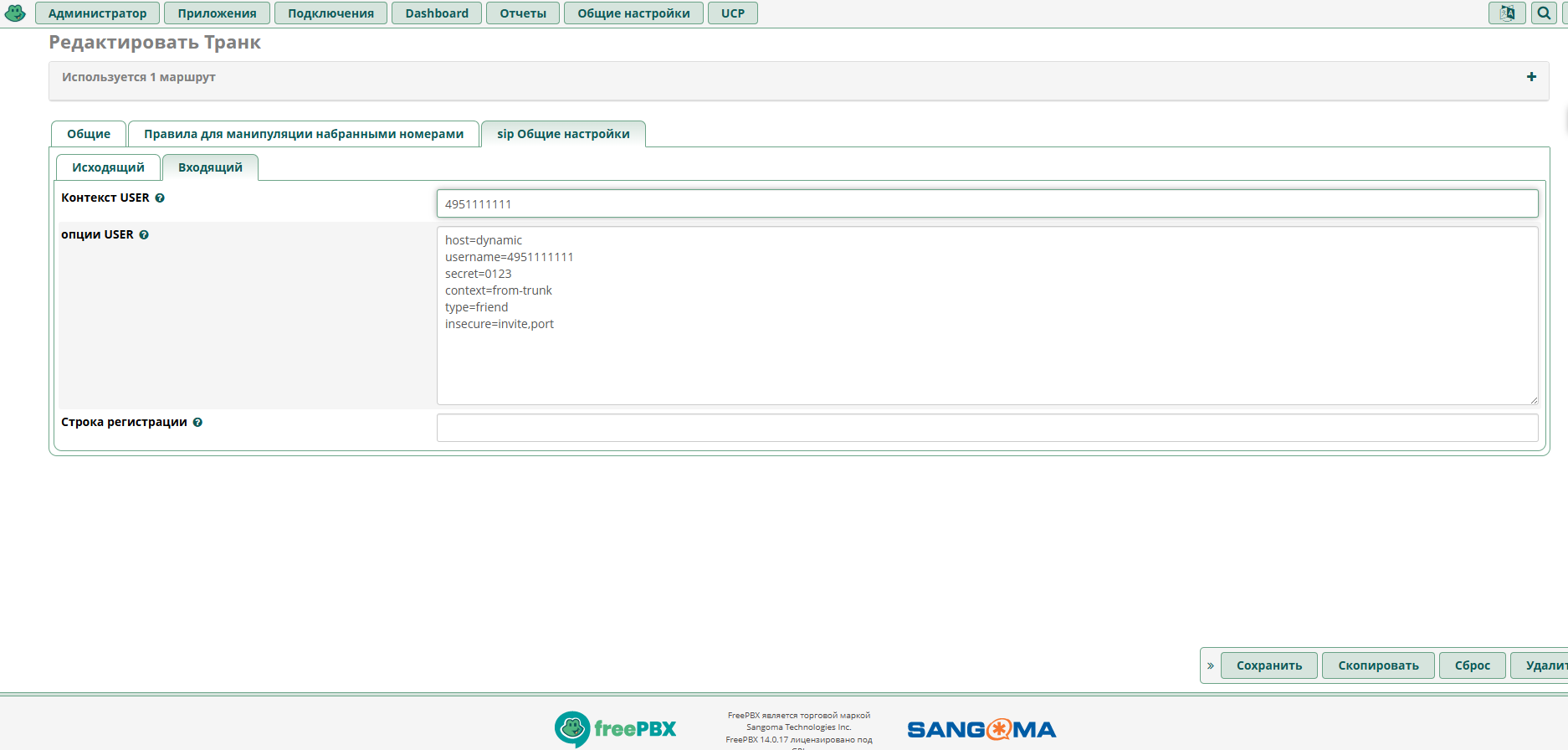 Схема такая, Sangoma FreePBX Astrisk версия 13(SIP): ТФОП линия Ростелеком с caller id, подключена к голосовому VOIP шлюзу DVG-7111S к порту FXO, шлюз подключен к роутеру с WIFI кабелем витая пара, со стороны шлюза порт WAN роутера LAN, в роутер подключен витой парой порт LAN подключен компьютер с FREEPBX IP 192.168.0.3, смартфон с софтфоном связан по WIFI роутером, всё в локальной сети. Входящий звонок с сотового телефона на городскую линию ТФОП идет через VOIP шлюз через FREEPBX на софтфон смартфона. В FREEPBX настроен транк городского номера 4951111111, входящая маршрутизация городского номера 4951234567, внутренний номер 702, на софтфоне смартфона СИП аккаунты городского номера 4951234567, внутреннего номера 702. На софтфоне высвечивается если в шлюзе включена опция Put Caller ID In URI следующее, пока идет звонок, IP 702, и сотовый номер 89111111111, после завершения звонка во входящем журнале софтфона, записывается номер 89111111111@192.168.0.3 типа SIP URI. Можно ли средствами WEB интерфейса FREEPBX отсечь правую часть от @ IP адрес? Провобал прогонять через опцию set caller id FREEPBX там два параметра, один из них CallerID номер ${CALLERID(num)}, но он только с левой части до @ вырезает цифры. Или стандартными средcтвами не вырезать правую часть, и надо кастомный файл конфигурации FREEPBX писать используя функции EXTEN, DIAL, CUT?