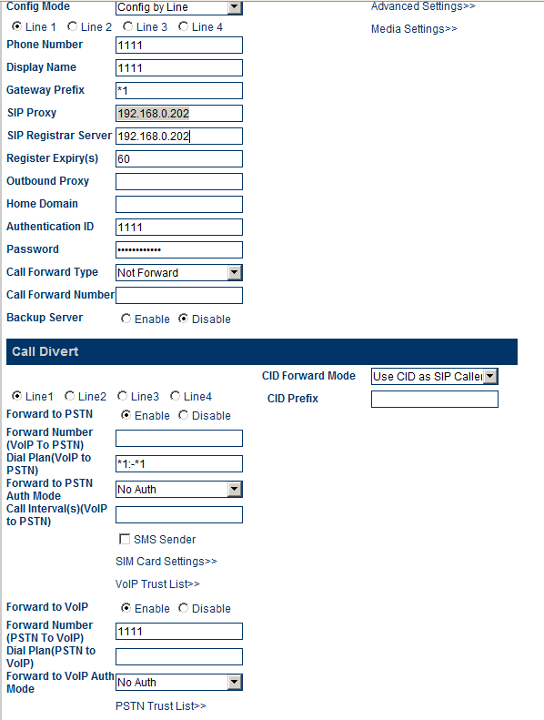 Outbound Dial Prefix: 1 (добавлять префикс к набираемому номеру чтобы шлюз знал что эти вызовы надо через первый канал отправлять. Обрезание этой единички на шлюзе настраивается как я уже говорил на картинках ранее в теме)