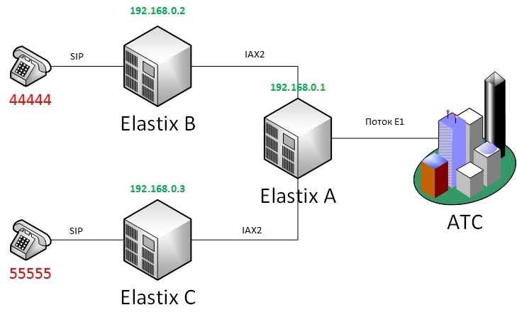 Первым хотел поставить именно FreeBSD с астериском, так как на мой взгляд это наиболее верное решение, все таки фря серверная платфома, но не получилось в виду слабого понимания работы этой операционки :(. Вторым вариантом взял AsteriskNOW, как писалось на сайте, полностью готовое решение, но на этапе соединения двух серверов начались траблы и как я понял, связаны с неким лицензированием. Далее мой взгляд пал на Elastix, установка прошла успешно, соединение двух серверов тоже на высоком уровне в отличии от AsteriskNOW, что не могло не порадовать. Далее встал вопрос с возможностью заставить работать 2 тестовых Asteriska через боевой Asterisk компании. (См. рисунок)