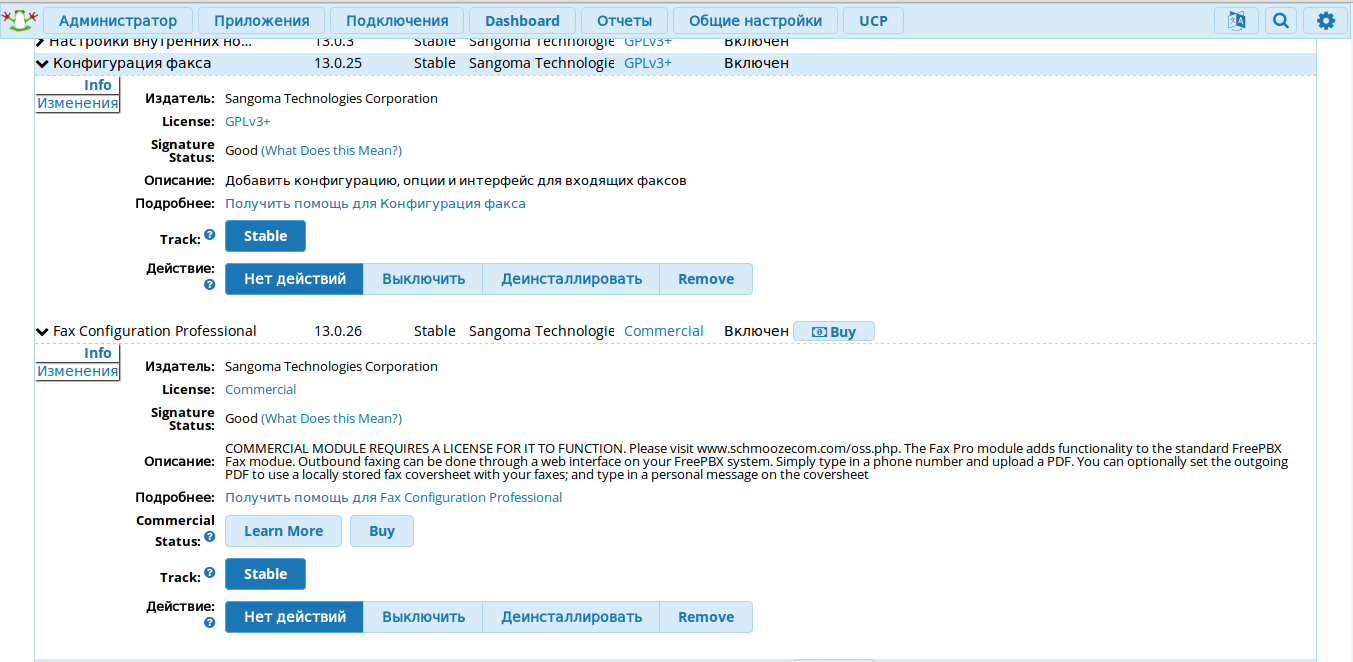 в разделе управления модулями есть два модуля - "Конфигурация факса" с лицензией GPL и "Fax Configuration Professional" коммерческий модуль. судя по описанию коммерческого модуля он и должен предоставлять меню ФАКС в UCP. написано - модуль включен, но стоит кнопка "Buy" при нажатии на которую предлагается купить лицензию.