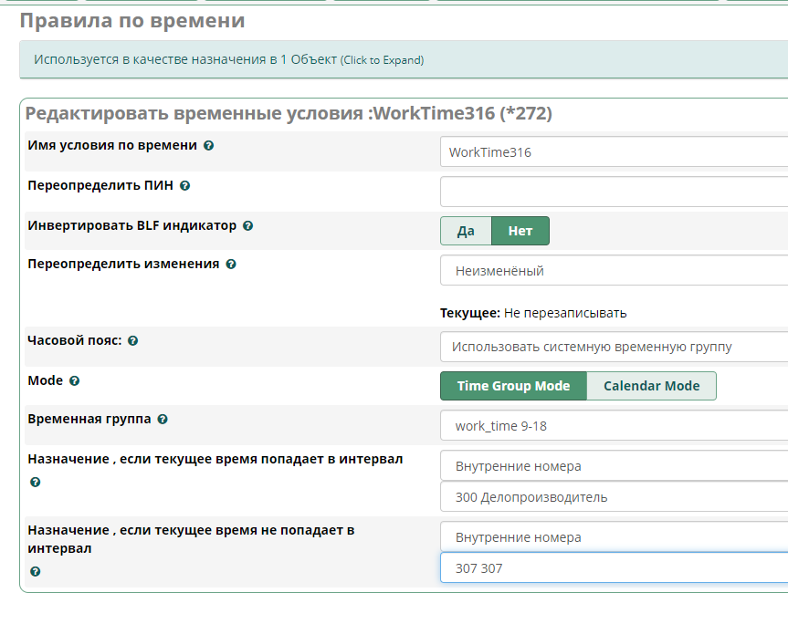 В приложения - правила по времени выбранная временная группа созданная выше настроена так, что при текущем совпадении времени должно вызываться IVR меню, а при не совпадении проигрываться сообщение "вы позвонили в нерабочие часы"
