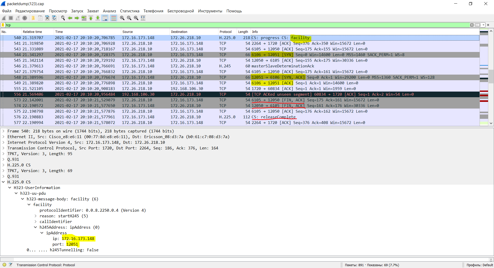 3) после открытия TCP-соединения для второго канала PBX закрывает первый канал H.245 достаточно грубым способом - путем закрытия TCP-соединения (на картинке подчеркнуто красным);