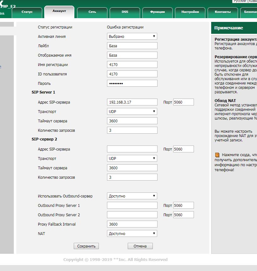 * Если телефоны будут находиться на удаленных объектах (за NAT), то указываем внешний адрес сервера Asterisk (никаких других настроек со стороны аппарата Yealink T19P E2 при работе за NAT не требуется).