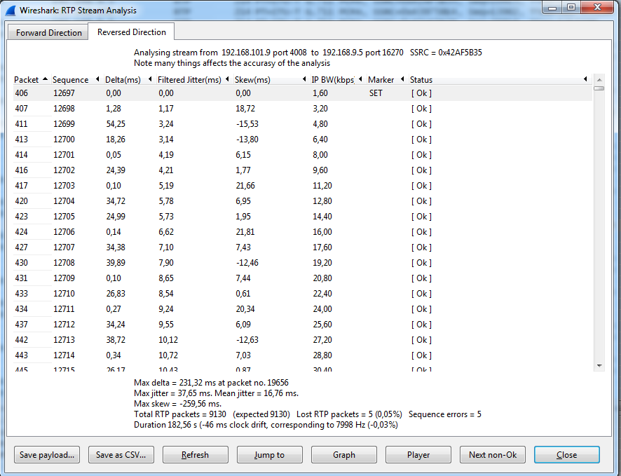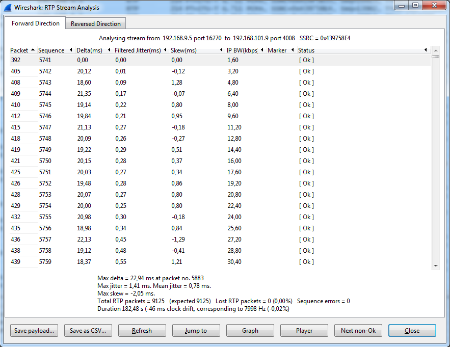 адаптивный jitter не особо эффективен при подобном. В Wireshark в плеере RTP можно задать нужный jitter buffer - на нем и поиграться подобрать.Skew is a measure of how late (or early) the current packet is for the total conversation (relative to the nominal packet rate). So if the packet rate should be 50 pps and say the 1000th packet of the conversation arrives 20.03 seconds after the 1st then the skew for that packet would be -30ms