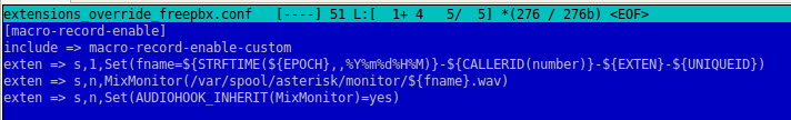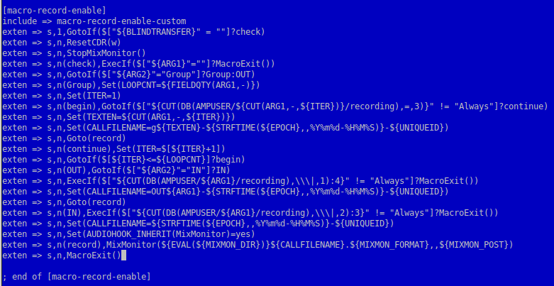 все просто, единственно что я работаю под freepbx и поэтому в extensions_custom.conf не сохраняться изменения, поэтому надо прописывать в extension_override_ferpbx.conf который выстраивать приоритет для макросов, т.е. подменяет на аналогичный. На картинке подленный скриншот синтаксиса.