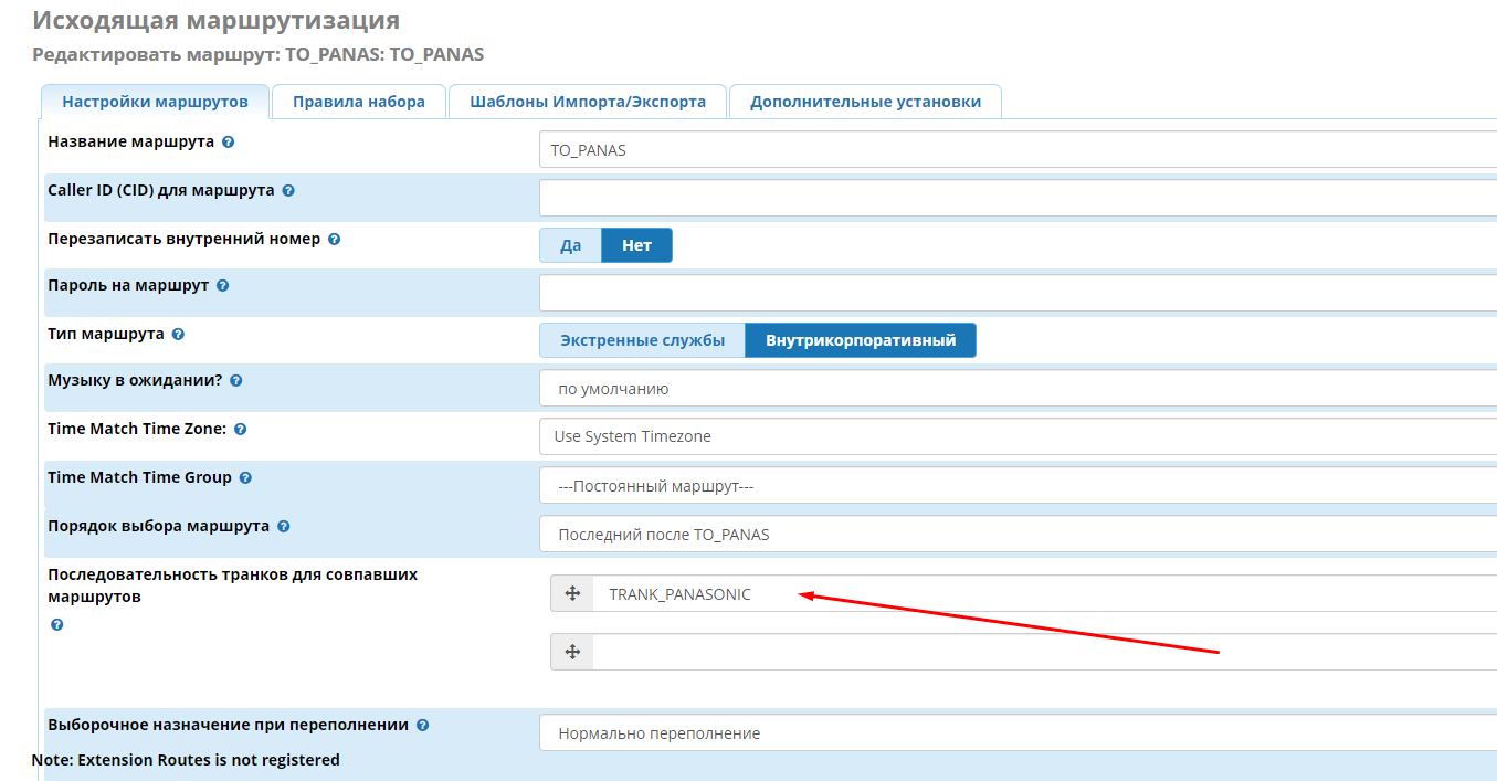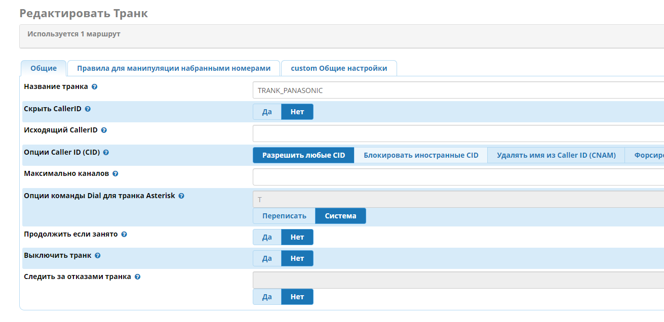 Во FrePBX14 создал Cuscom trank (файлы trank1_x) и исходящий маршрут (файлы isx1_x)