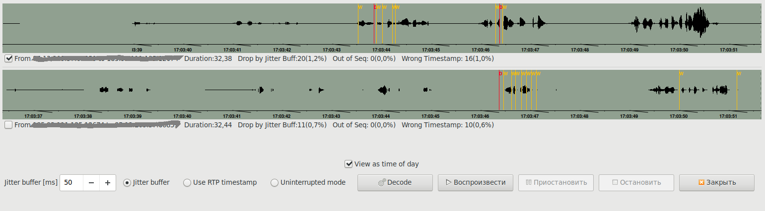 На записи звонка всё слышно шикарно, начал ловить симптоматику вручную. При отзвоне мне на мобильный услышал косяк: микропрерывания звука. Буд-то звуковая дорожка с пробелами.