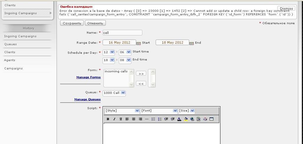В Ingoing Calls добавил эту самую очередь, пытаюсь создать ingoing compaings. выдает ошибку валидации(Error de conexion a la base de datos - Array ( [0] => 23000 [1] => 1452 [2] => Cannot add or update a child row: a foreign key constraint fails (`call_center/campaign_form_entry`, CONSTRAINT `campaign_form_entry_ibfk_2` FOREIGN KEY (`id_form`) REFERENCES `form` (`id`)) ))))). скриншоты прилагаю. помогите пожалуйста сделать очередь, чтобы она работала. может я что не так делаю.