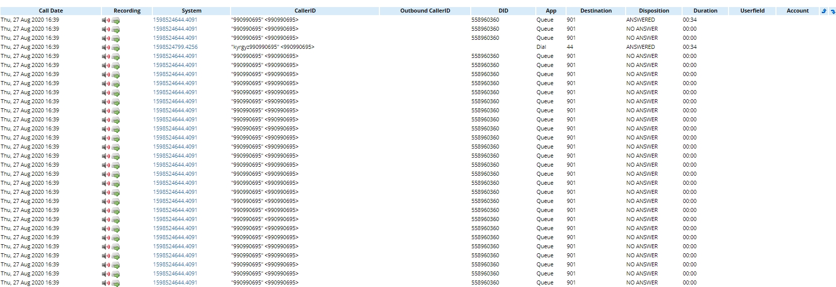 ПРоблема такая: Не правильно выводится информация в CDR Repots. Выбирается период в один день, например 27 августа с 9:00 до 18:00, а выводится, дублируясь, одна запись(скрин прилагается). Хотя в Call Event Logging все выводится нормально.