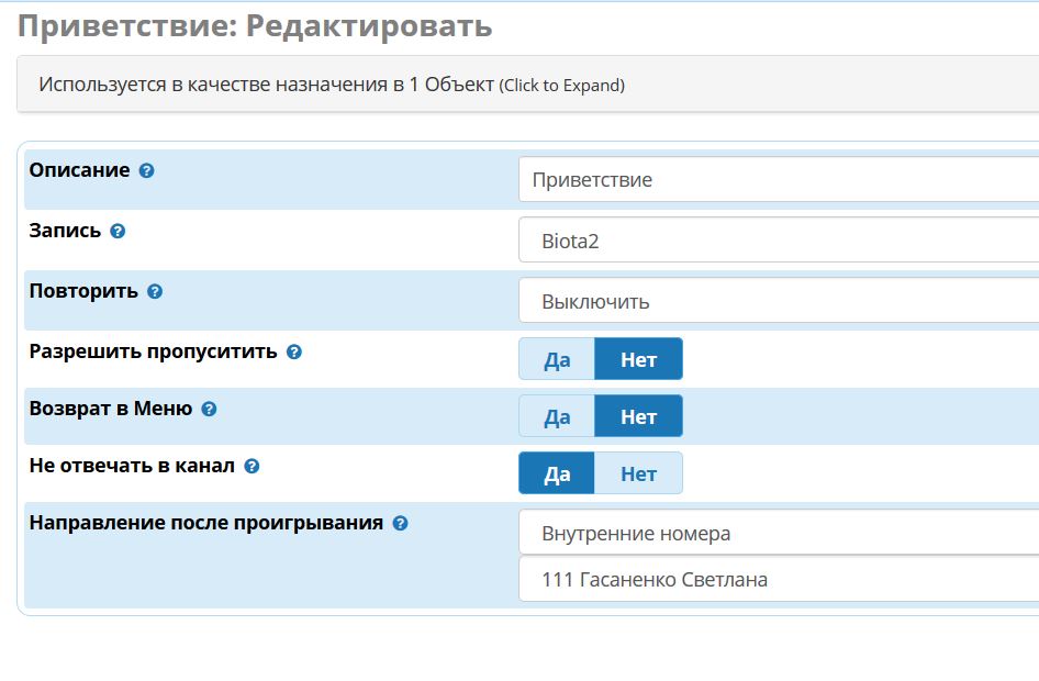 А в приветствии - что является назначением после воспроизведения? Внутренний номер 111?