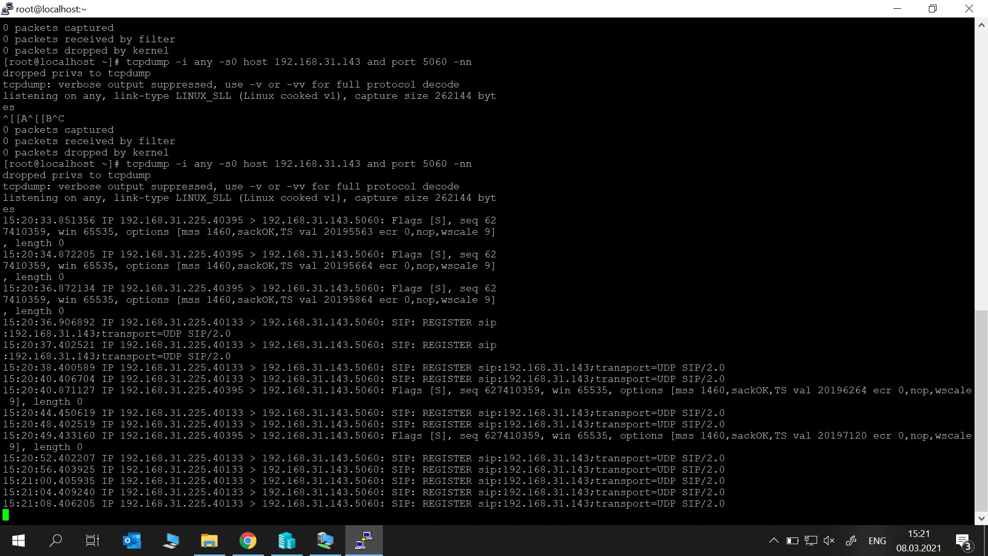Что сделано. На рабочем ноуте на Hyper-V установлен Asterisk 16 (LTS) на ОС CentOS 8. Ошибки есть, но, как я понимаю, не критичные. Создан один SIP-абонент с номером и паролем. На мобильном телефоне установлен клиент ZoiPer (просто название понравилось). Клиент пытается зарегистрироваться - это видно по результату команды tcpdump -i any -s0 host 192.168.31.143 and port 5060 -nn. Но регистрация на телефоне не осуществляется. Я явно упустил что-то, но не могу понять что.