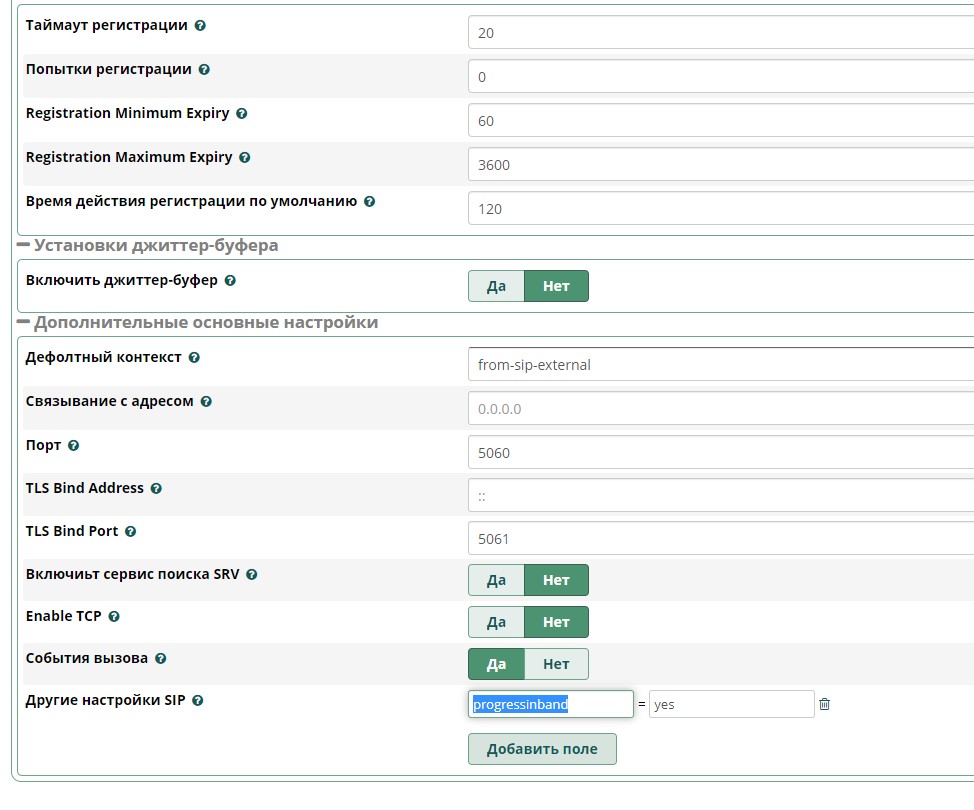 в настройках freepbx в Дополнительные основные настройки для chan_sip
