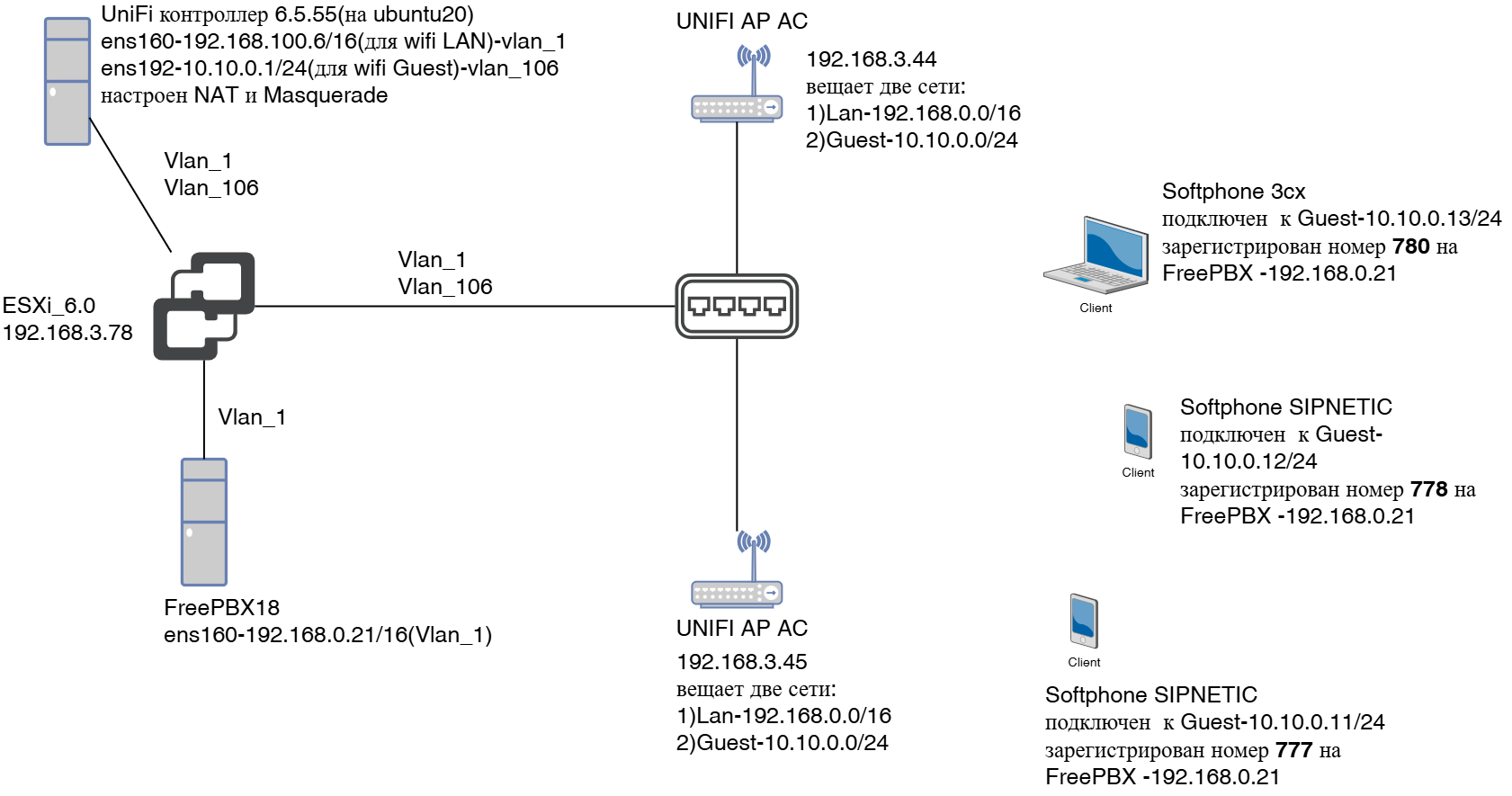 Добрый день! Ребят может кто подскажет в чем проблема, периодически с софтфона на телефоне прилетает в asterisk unreachable.При этом пинги не пропадают до клиента с контроллера unifi.Приложу схему сети, думаю должно быть понятно как устроено. Если телефон подключить к сети LAN таких проблем нет. При чем статус может быть unreachable ,а звонки проходят 50/50.