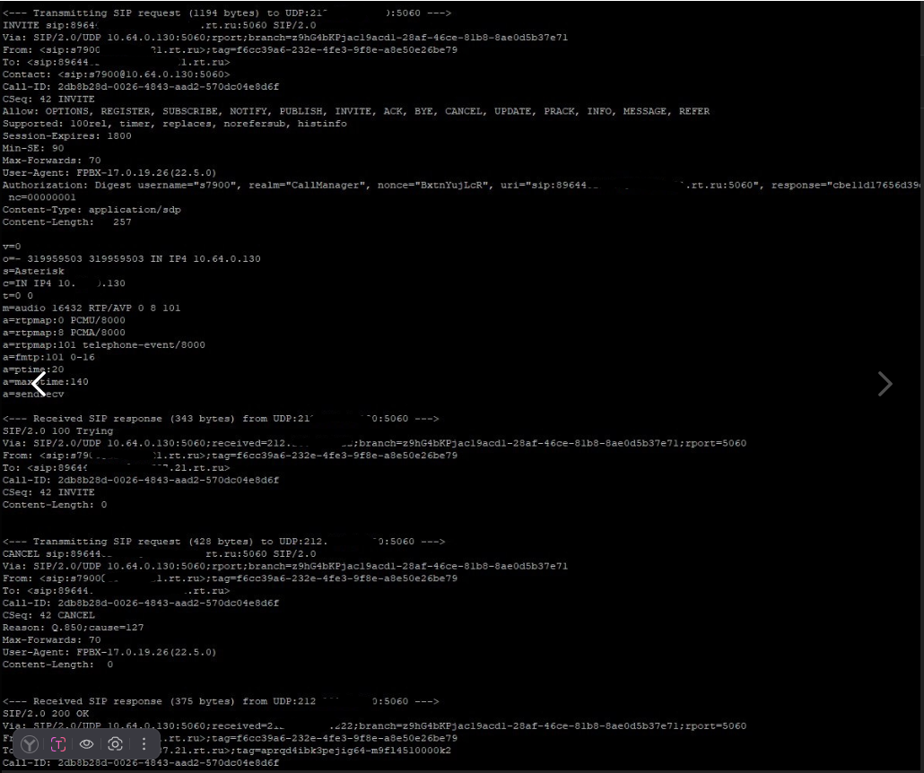 invite проходит дальше от РТ приходит trying и через полторы секунды астер рвет соединение.