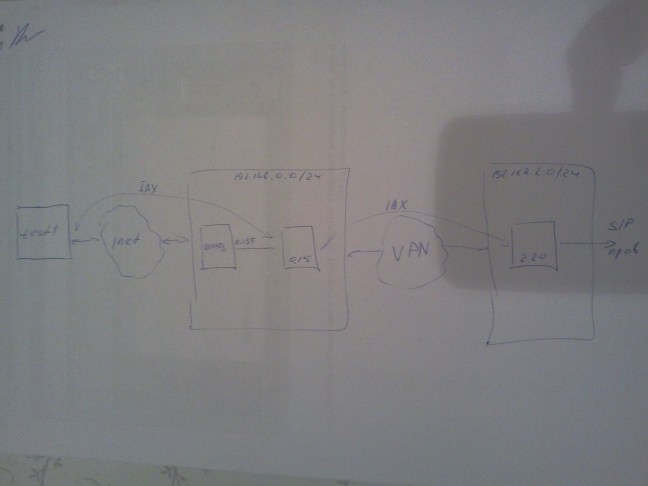 (клиент IAX за NAT) <-> (шлюз с пробрососом порта 4569 на сервер 0,15) <-> (собственно сам 0,15) <-> VPN <-> (сервер 2,20) <-> (SIP провайдер)