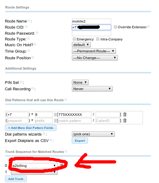 Настраивать A2billing не приходилось, нашел инструкцию по установке и настройке с asterisk и freepbx, вот ссылка http://www.powerpbx.org/content/a2billi ... l-guide-v2, Хотелось узнать каким образом, все это должно отрабатывать, я понимаю что исходящие звонки должны отрабатывать через транк A2B/1, завел транк идентичный как на asterisk, после чего настроил исходящий маршрут через транк A2B/1, но ничего не происходит, прошу помочь, заранее благодарен.