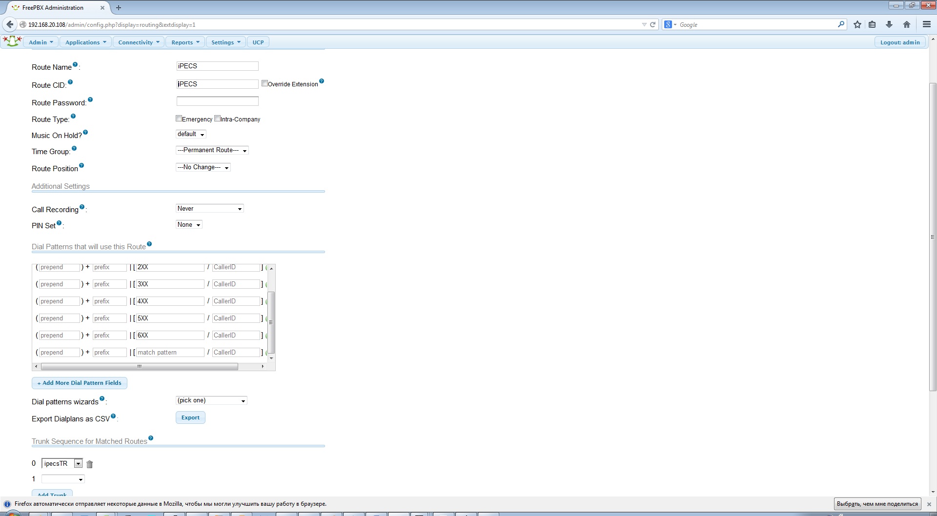 Соединил через транк iPECS и Asterisk, создал исходящий маршрут в Astere, со стороны iPECSa звонки на Aster проходят и слышимость в обе стороны, а вот со стороны Astera звонки на iPECS не уходят .... в трубке женский голос говорит что линия занята! В чем может быть проблема???