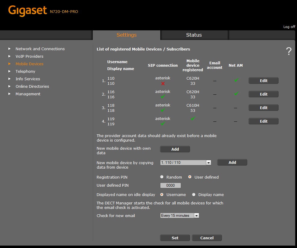 Сразу ответы - регистрировал Gigaset 610 и Panasonic TGP500 - работают но отсуствует отображение кто звонит (номер) - просто надпись - входящий звонок.