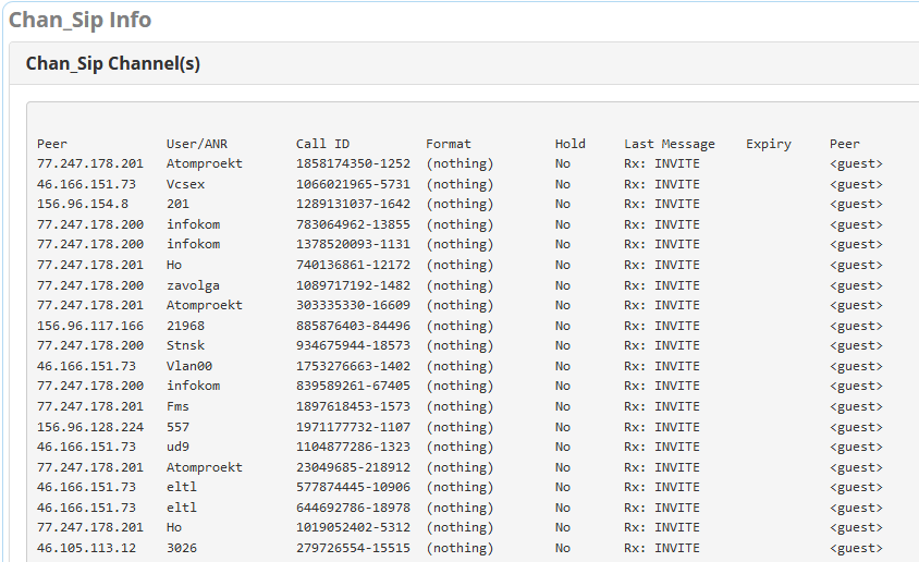 Peer             User/ANR         Call ID          Format           Hold     Last Message