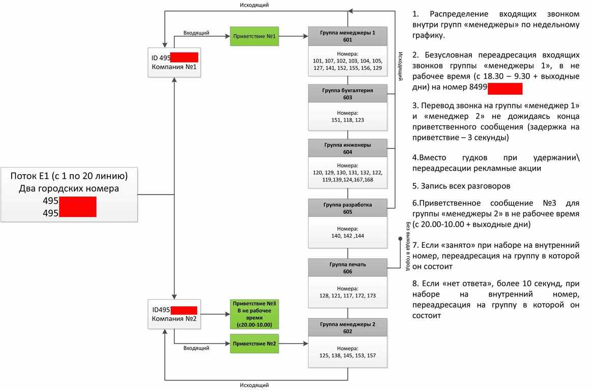 Еще не работает исходящая и входящая маршрутизация для групп «менеджеры 1» и «менеджеры 2». При исходящих, не важно, из какой группы, используется номер